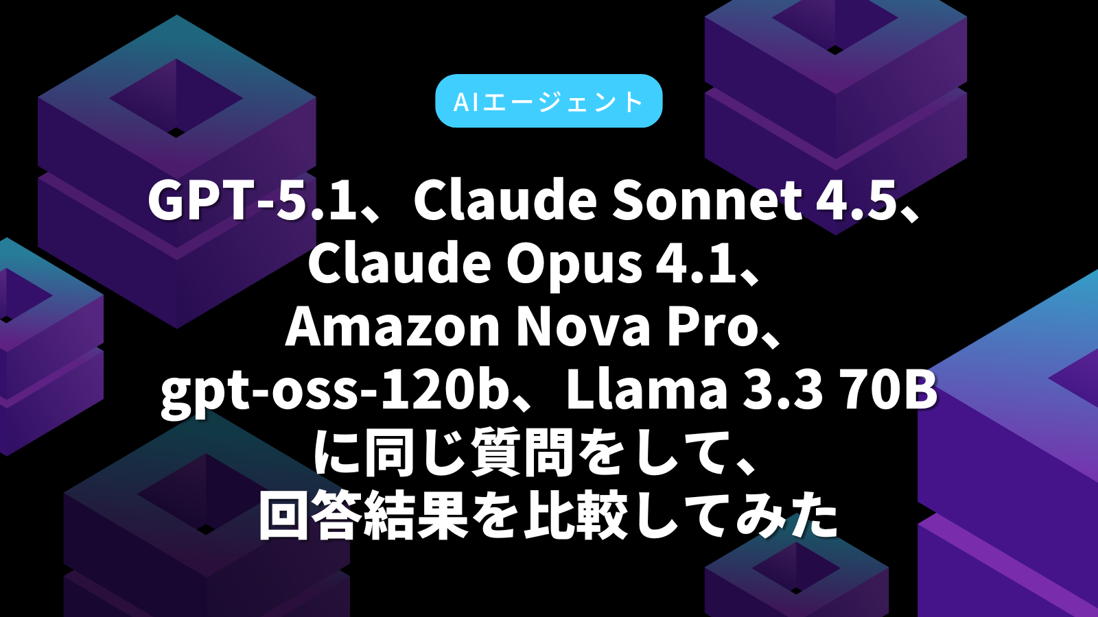 GPT-5.1、Claude Opus 4.1、Claude Sonnet 4.5、Amazon Nova Pro、gpt-oss-120b、Llama 3.3 70Bに同じ質問をして、回答結果を比較してみました。
